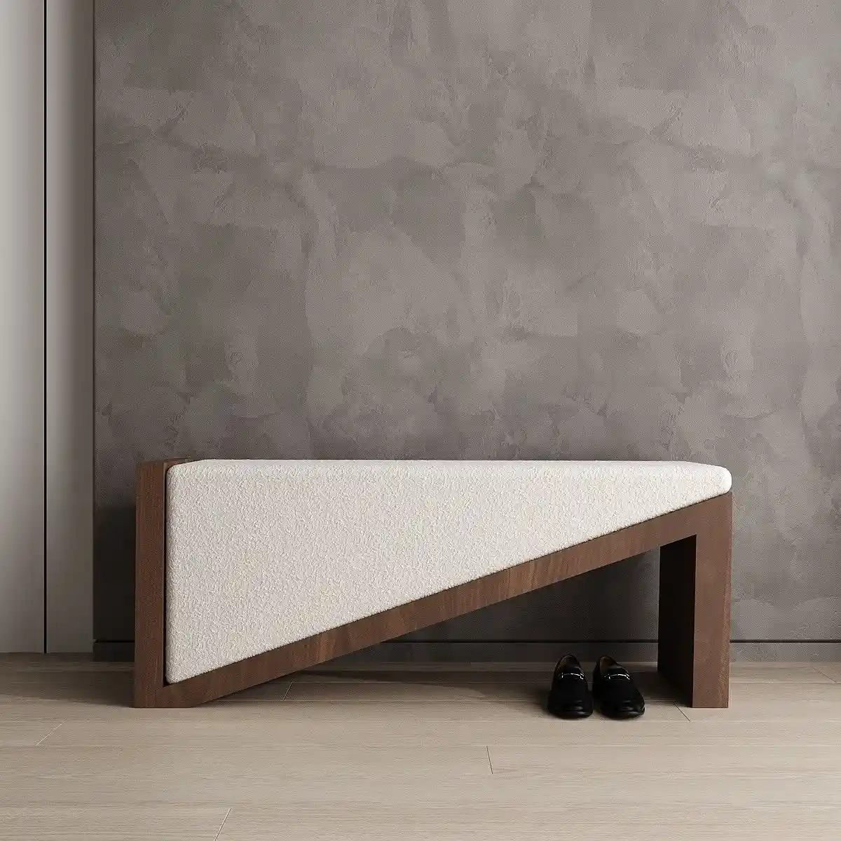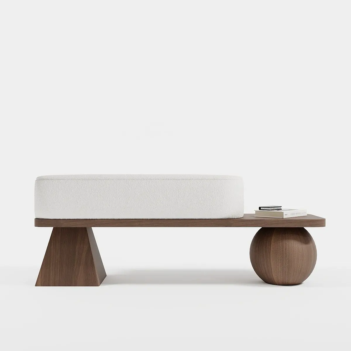 Bring home a masterpiece of modern design with this luxury designer bench. Crafted with a unique sculptural wooden base featuring a curved arc and spherical support, it is topped with a soft cushioned seat for ultimate comfort. This bench doubles as functional seating and a statement piece of art for your home.